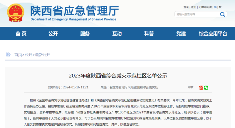 近日,陕西省应急管理厅发布《2023年度陕西省综合减灾示范社区名单公示》。经各地应急管理部门推荐、实地抽查、资料审核等程序,拟命名“长安区郭杜街道书苑社区”等100个社区为2023年度省级综合减灾示范社区,公示时间:2024年1月16日至2024年1月23日。其中,我市24个社区入选,具体名单如下: