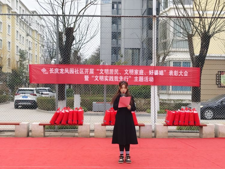 长庆龙凤园社区党委副书记刘香宣读《泾渭街道长庆龙凤园社区关于文明月表彰活动的决定》