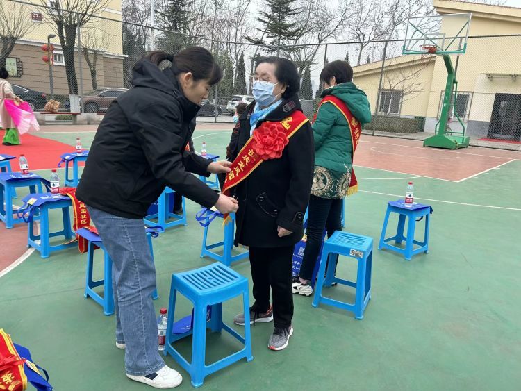 高延工业服务处泾河园离退休服务站代表闫红为荣获“好婆媳”称号的家庭颁发证书及奖品。