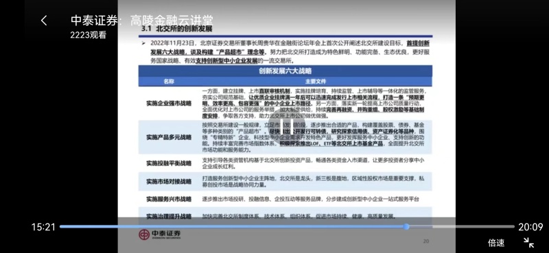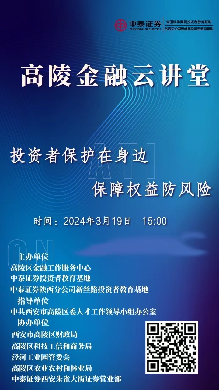 为贯彻落实中央金融工作会议精神,做好金融服务“五篇大文章”,优化金融营商环境,持续加强企业挂牌上市宣传,结合多层次资本市场发展,提升辖区企业及投资者风险应对能力和可持续金融发展,3月19日,高陵区金融工作服务中心联合中泰证券陕西分公司新丝路投资者教育基地、新浪财经组织开展了“高陵金融云讲堂”系列活动之“投资者保护在身边•保障权益防风险”宣传培训活动。本次专题培训共2300余人次在线参与。