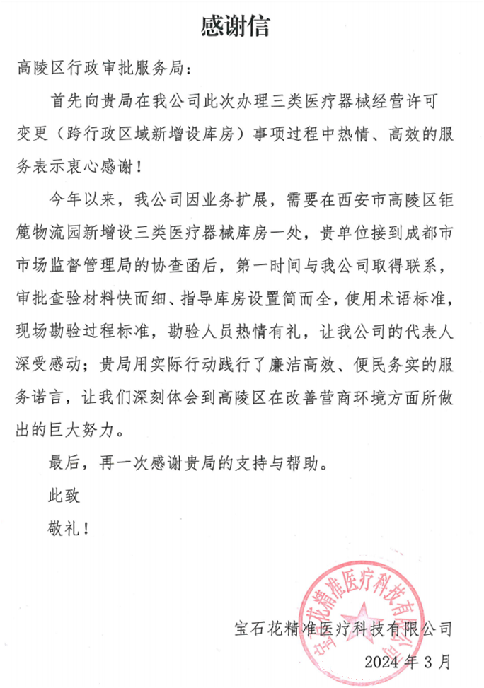 “真的特别感谢你们专业、耐心、热情的服务,让我们及时办理了三类医疗器械经营许可变更,太谢谢你们了!”3月19日,宝石花精准医疗科技有限公司高陵库区负责人贾变亲自将成都集团公司的感谢信送到高陵区行政审批服务局激动地说到。