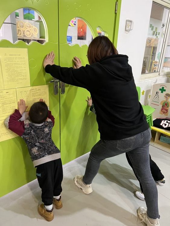 听到警报声后,班级教师组织孩子们立即停止活动,引导幼儿在教室躲进隐蔽处,老师们关闭门窗,用桌椅和柜子堵住教室门,以防“歹徒”破门而入。同时,班级教师立即安抚幼儿情绪,清点幼儿人数,保障每一位幼儿的安全。