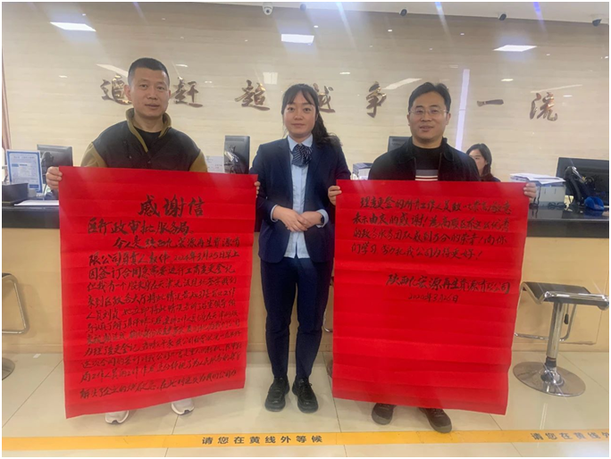 “说实话,这几年,我公司经营状况一直不好,幸亏你们容缺为我公司办理了变更登记,才让我有机会顺利签订合同,这次合同的签订对我们公司来说是个重大转机,太谢谢你们了!”3月26日下午,陕西亿宏源再生资源有限公司负责人权先生激动地将感谢信送给高陵区行政审批服务局工作人员。
