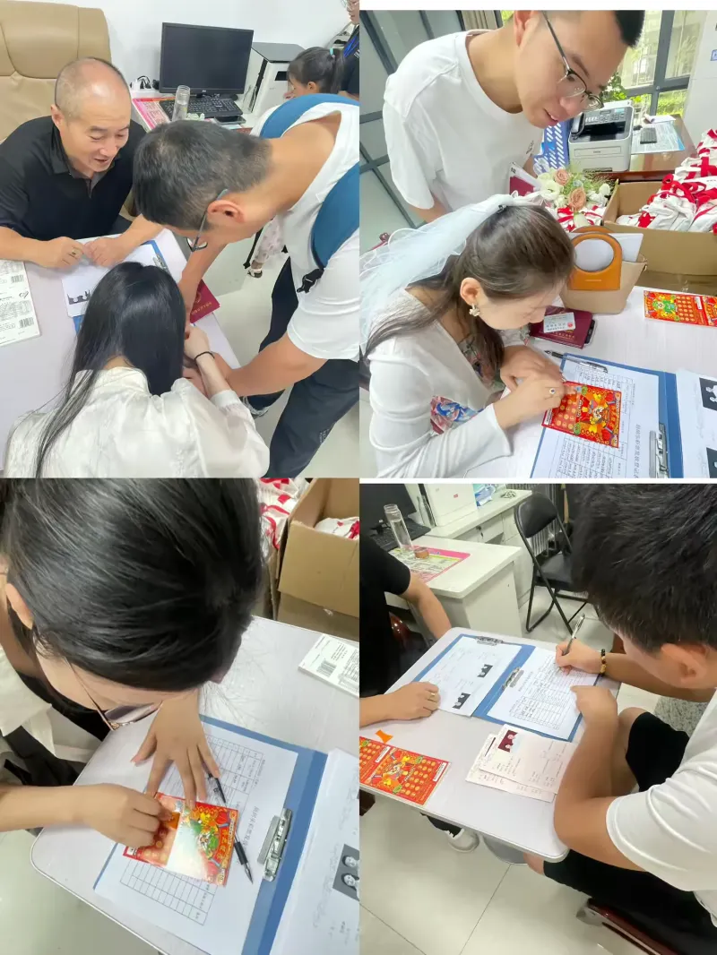 接过这份特别的礼物,新人们脸上绽放着灿烂的笑容。有人迫不及待地当场刮开彩票,期待着幸运的降临;有人则将彩票收好珍藏,视为一份珍贵的纪念。