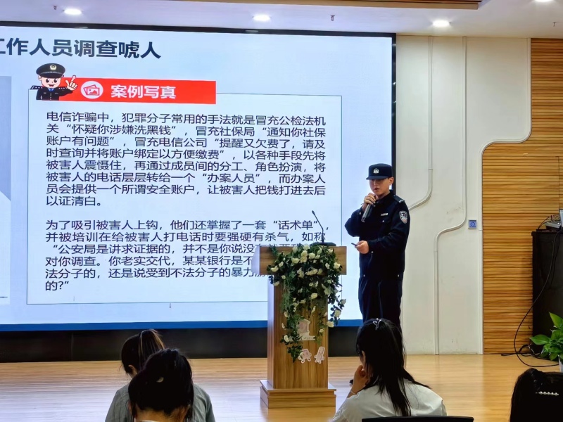 鹿苑派出所民警以“远离电信诈骗”为主题,从诈骗的概念、诈骗的类型、诈骗的案例、预防诈骗、被诈骗后的补救这五个方面展开讲述,从职工的角度去看问题,从现实生活出发,让校园职工更能全身心的参与到讲座中,民警通过讲述近期辖区内高发案件的类型以及多发诈骗案例,如冒充学生家长、冒充亲友、冒充公检法、刷单返利、冒充客服等诈骗类型,剖析电信网络诈骗的手段特点、危害及防范技巧,结合身边案例以案释法,从鲜活的事件案例中让职工们将反诈知识铭记于心,让职工警惕诈骗,识别诈骗,不向陌生人转账,并下载国家反诈app,发现警情立即拨打鹿苑派出所电话029-86912027,更迅速做到及时预防,及时止付。
