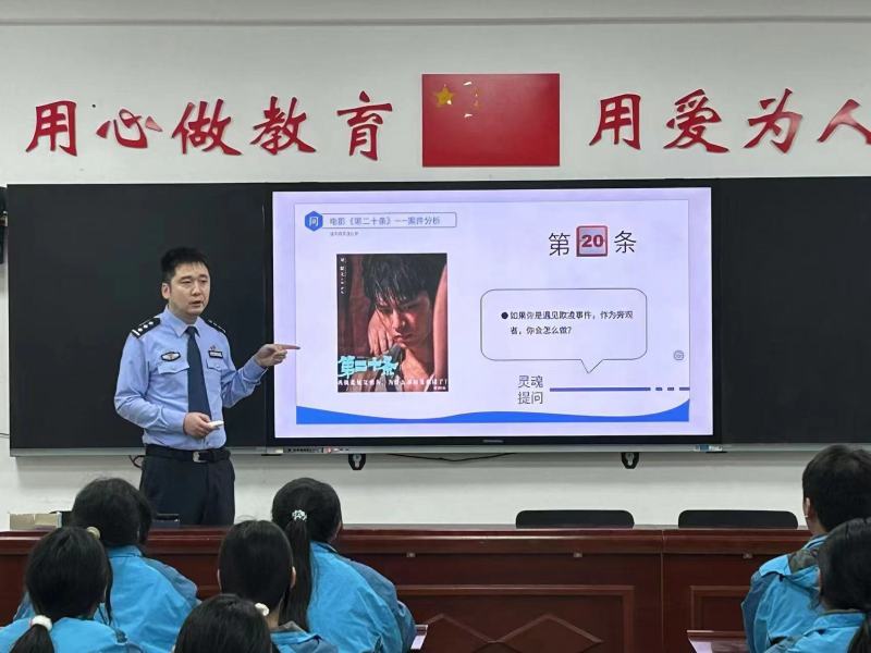 课堂上,分局耿镇派出所副所长焦增科以“法不能向不法让步”为主题,从防范校园欺凌、防范电信网络诈骗等方面进行了详细讲解,结合相关的实际案例,生动形象地进行了分析,强调了校园中常见的安全问题,提醒学生们加强安全防范,遵守法律法规,树立自尊、自立、自强的意识,做到“慎交友、有志向、善思考、敢维权、要坦白”。同时,宣讲民警向在场学生发出倡议,号召大家从自身做起、从现在做起,积极主动学习法律法规知识,做到知法、懂法、守法、用法,依法规范自己的言行,做守法文明公民。