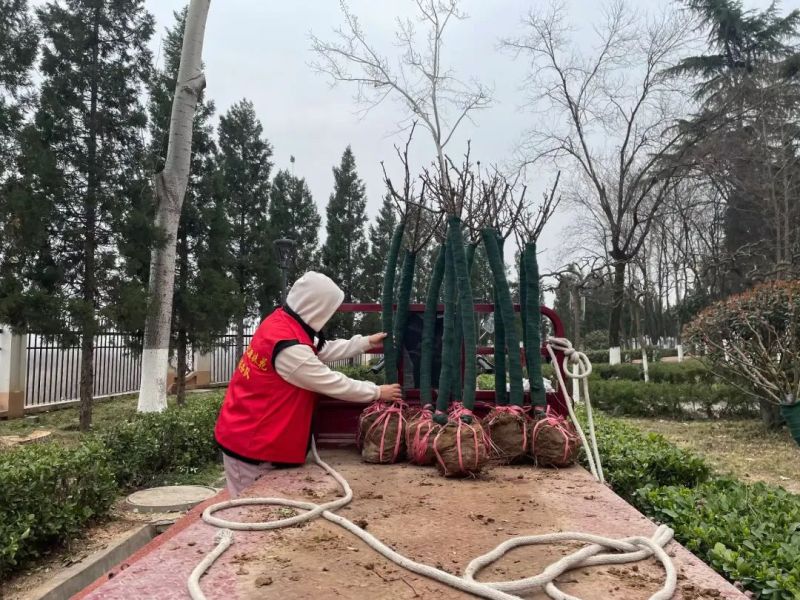 随后,大家分成若干小组,迅速投入到种植活动中。有的小组负责搬运月季苗,确保每一株幼苗都完好无损;有的小组专注于挖坑施肥,为月季的生长打造良好的土壤环境;还有的小组精心地将月季苗植入坑中,仔细扶正、填土、浇水。大家分工明确,配合默契,每一个步骤都严谨认真。