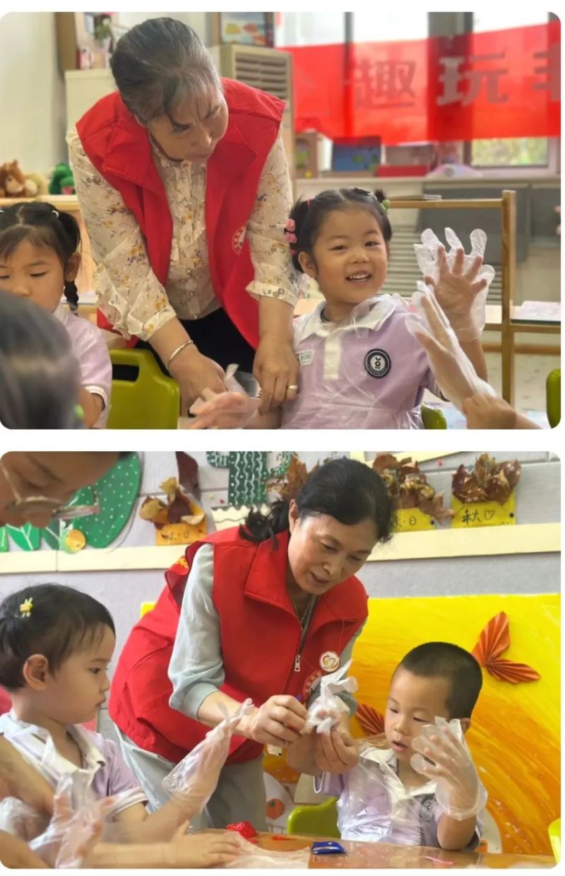 活动现场,社区非遗传承队许奶奶手持传统拓印工具,向孩子们演示“上纸、沾墨、捶打”的完整工艺流程。“小朋友们看,这个拓包要像小兔子跳跳一样轻轻拍打。”银龄志愿者们化身为“银发教师”,分组指导幼儿操作。在志愿者指导下,30名幼儿完成了自己的非遗“首秀”。