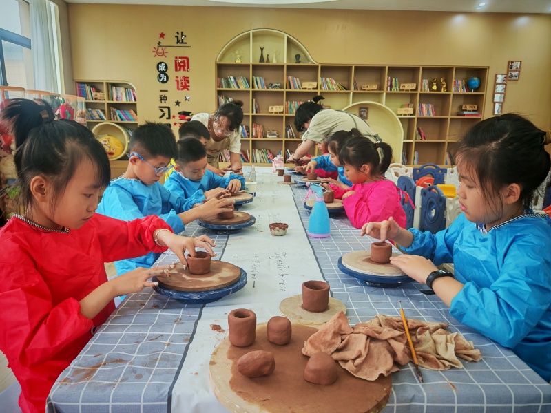 7月7日上午,非遗项目体验课上,孩子们跟老师学习陶艺制作,来自专业机构的老师手把手进行教学,从文化传承的角度,对陶泥制作、非遗文化进行讲解,让孩子们零距离感悟非遗的艺术魅力。自6月30日起,南新社区暑托班开班,吸引众多3 - 12岁社区子女。课程丰富多元,含武术、绘本、陶艺等,培养孩子兴趣能力。社区儿童乐园设施新,有运动、益智、读书区,助孩子开心玩耍、健康成长 。