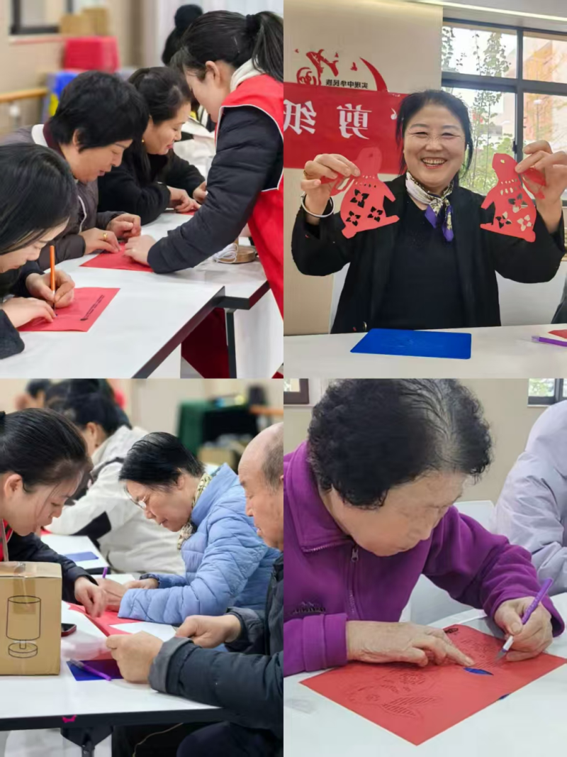 活动现场,老人们围坐在桌前,手持红纸与刻刀,在老师的细致指导下,一笔一划勾勒“金玉满堂”“福娃”等吉祥图案,再小心翼翼雕刻。指尖起落间,一张张普通红纸蜕变为精致的剪纸作品,老人们专注的眼神与不时响起的交流笑声,现场满是温馨。