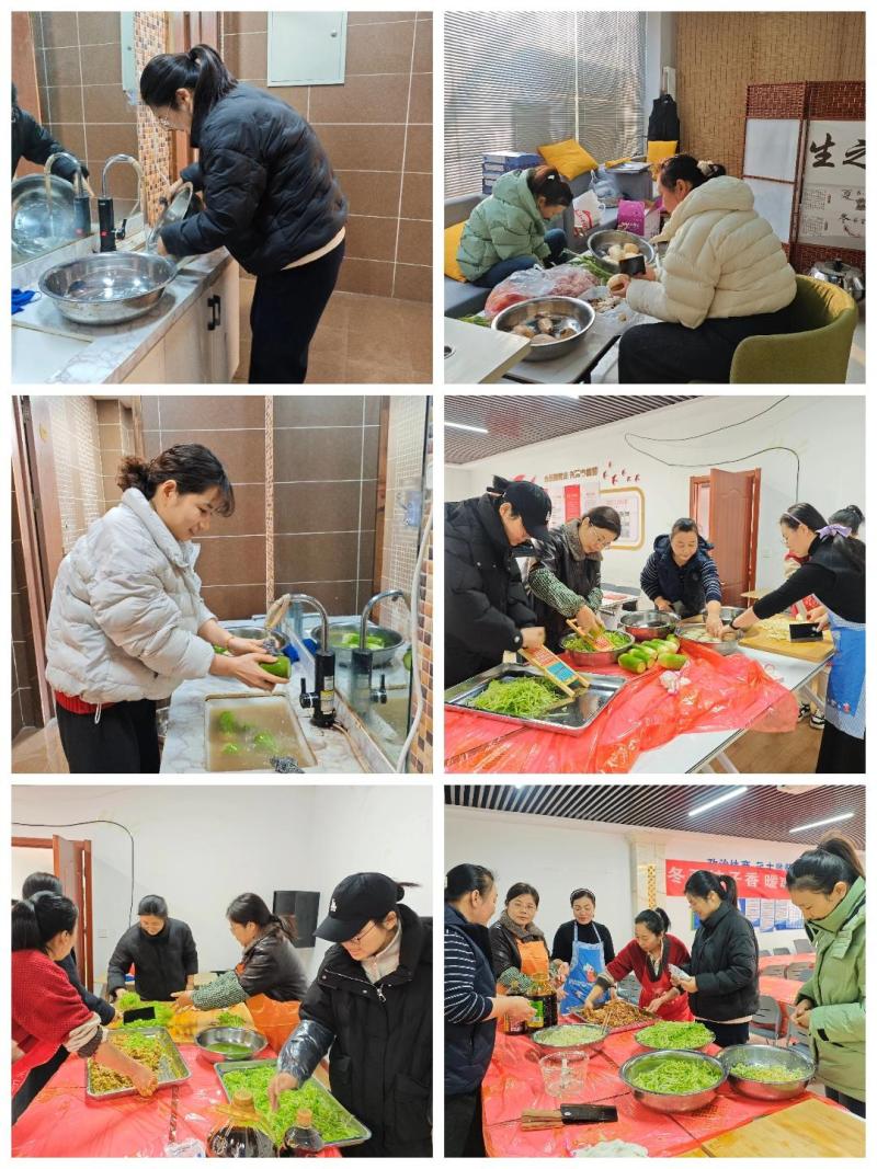 工作人员切菜的切菜,调馅的调馅,洗案板的洗案板,大家一边忙碌一边聊天,空气中渐渐弥漫起葱姜和肉馅混合的香味。忙完准备工作,墙上的时钟指向了下午两点,党员同志们、社区居民、退役军人陆续走进活动室,一进门就被桌上的饺子馅和整齐的桌椅吸引住了。大家一边笑着一边挽起袖子,自觉分成几桌,准备大显身手。