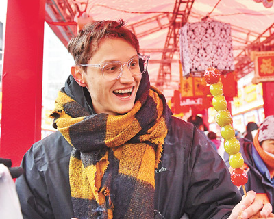 | 入境游 山东省青岛市市北区大鲍岛文化休闲街区糖球会上,一名外国游客在观赏糖球。 王海滨摄(人民视觉) |