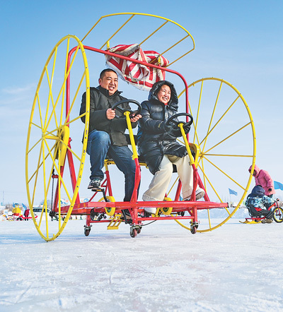 | 冰雪游 新疆维吾尔自治区昌吉回族自治州呼图壁县五工台镇百泉湖,游客在体验雪地自行车。 陶维明摄(影像中国) |