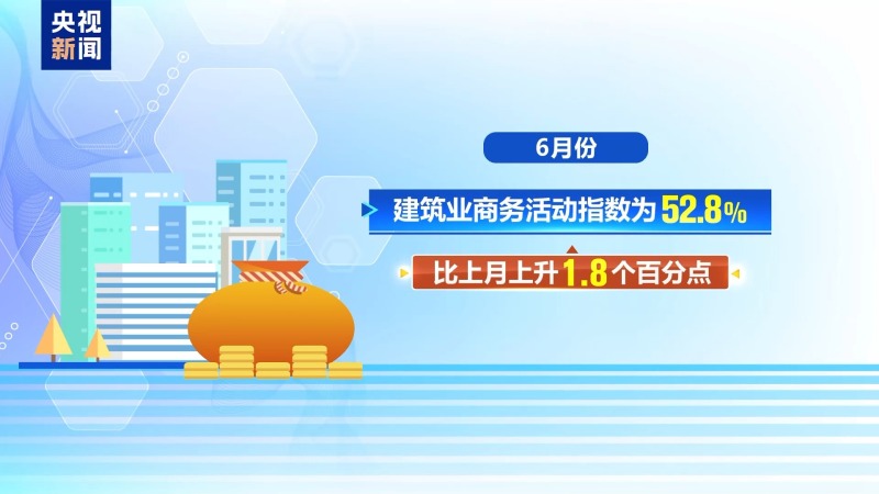 6月份建筑业商务活动指数为52.8%,比上月上升1.8个百分点,景气水平有所回升。其中,土木工程建筑业商务活动指数为56.7%,连续三个月位于55%以上较高景气区间,表明近期基础设施项目建设保持较快施工进度。