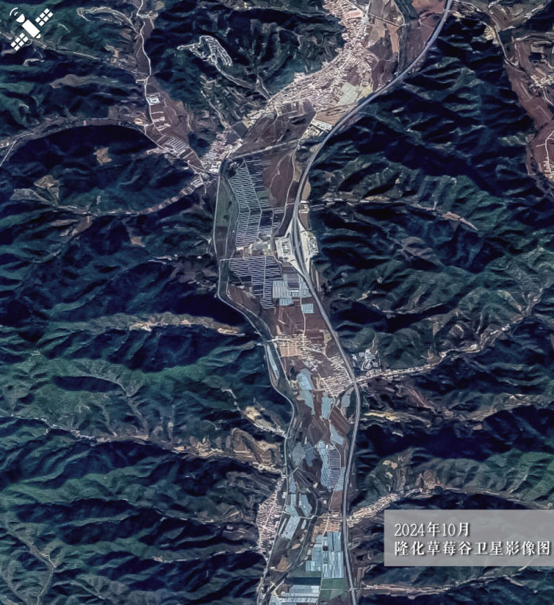 2024年10月的隆化草莓谷卫星影像图中可见连片草莓大棚群。