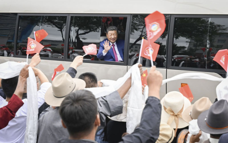 8月20日中午,中共中央总书记、国家主席、中央军委主席习近平率中央代表团乘专机抵达拉萨,出席西藏自治区成立60周年庆祝活动。这是习近平向欢迎群众挥手致意。新华社记者 谢环驰 摄