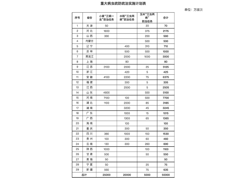 此外,马铃薯晚疫病在西南、西北和东北部分地区偏重流行,预计发生面积3000万亩,需实施预防控制面积4000万亩次;草地螟在内蒙古及其周边局部重发,预计发生面积2000万亩次;东亚飞蝗在环渤海湾、华北内涝湖库区可能局部点片高密度发生。