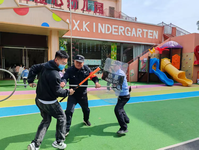 户外演练环节进一步模拟了复杂场景下的处置流程。民警们在幼儿园外的彩色地面区域展开进阶演练:面对“情绪激动人员”试图强行闯入的突发状况,警员们交替使用盾牌格挡与警棍威慑,精准完成“语言警告—装备阻隔—合力控制”的标准流程。从装备使用到人员控制,各环节衔接紧密,既体现了应急队伍的专业素养,也为在场观摩的师生直观展示了安全事件的应对方法。