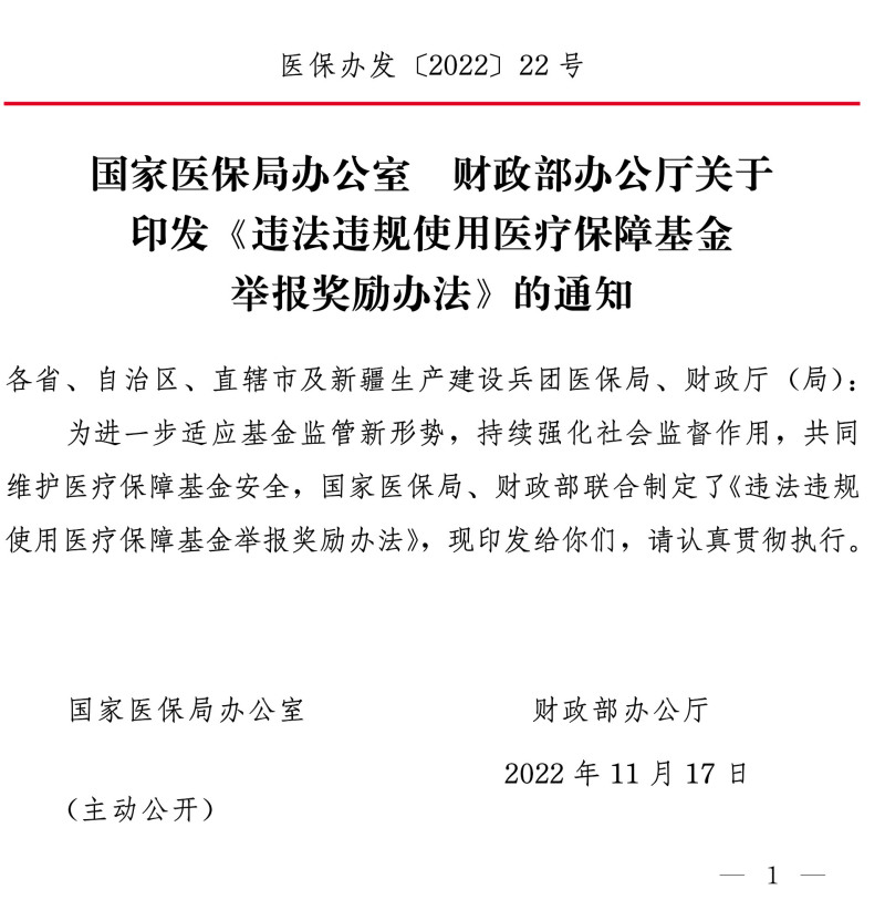 第十五条本办法由国家医保局、财政部负责解释,自2023年1月1日起施行。《国家医疗保障局办公室 财政部办公厅关于印发〈欺诈骗取医疗保障基金行为举报奖励暂行办法〉的通知》(医保办发〔2018〕22号)同时废止。