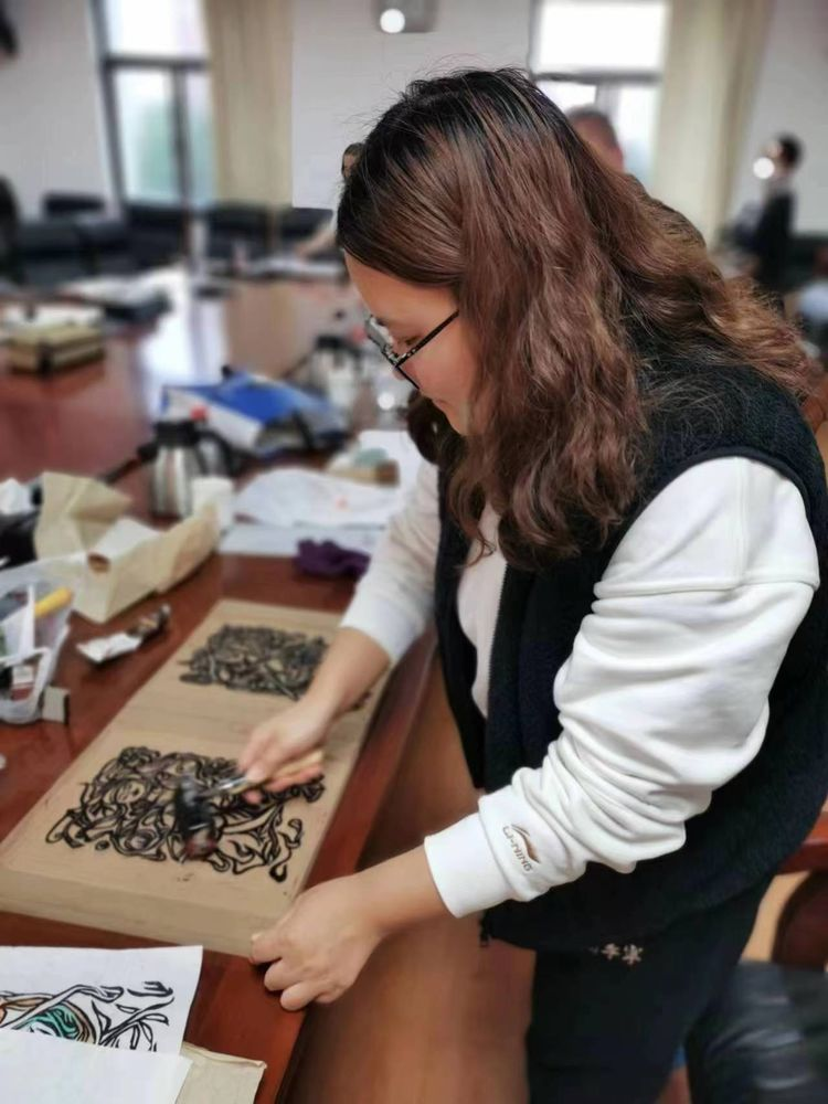 活动现场,来自西安美协会员、印见长安非遗工作室主理人马蒙老师向在场的人员详细讲解了拓片技艺的起源、种类、样式及制作流程,随后带领大家一起动手制作拓片。