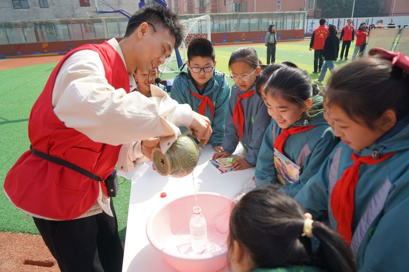 室外展区,志愿者通过倒流壶向学生演示了文物内藏的科技原理;文物知识展板前,孩子们在志愿者的精彩讲解下“云游”博物馆。孩子们在欢声笑语中参与文博科普知识互动、体验VR实景博物馆等项目。“我今天学到了很多历史知识,戴上VR眼镜仿佛进入了博物馆,今后我要好好学习,长大为祖国作贡献!”四年级(4)班学生胡欣彤说