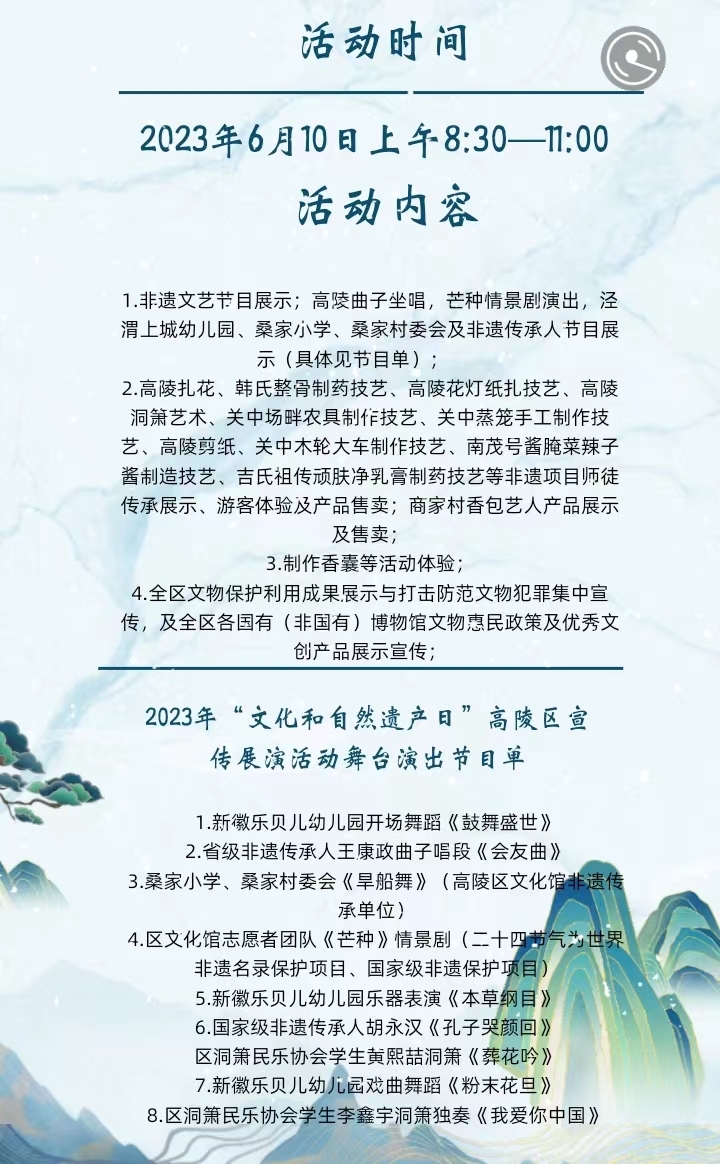 2023年6月10日,为全面贯彻落实党的二十大及习近平总书记关于文化遗产保护重要论述精神,宣传贯彻新时代文物工作方针,努力提高全社会文化遗产保护意识,严厉打击文物犯罪,在第14个“文化和自然遗产日”来临之际,高陵区委宣传部、区文化和旅游体育局与区公安分局联合举办的“高陵区2023年文化和自然遗产日宣传展演活动”在高陵博物馆开展。