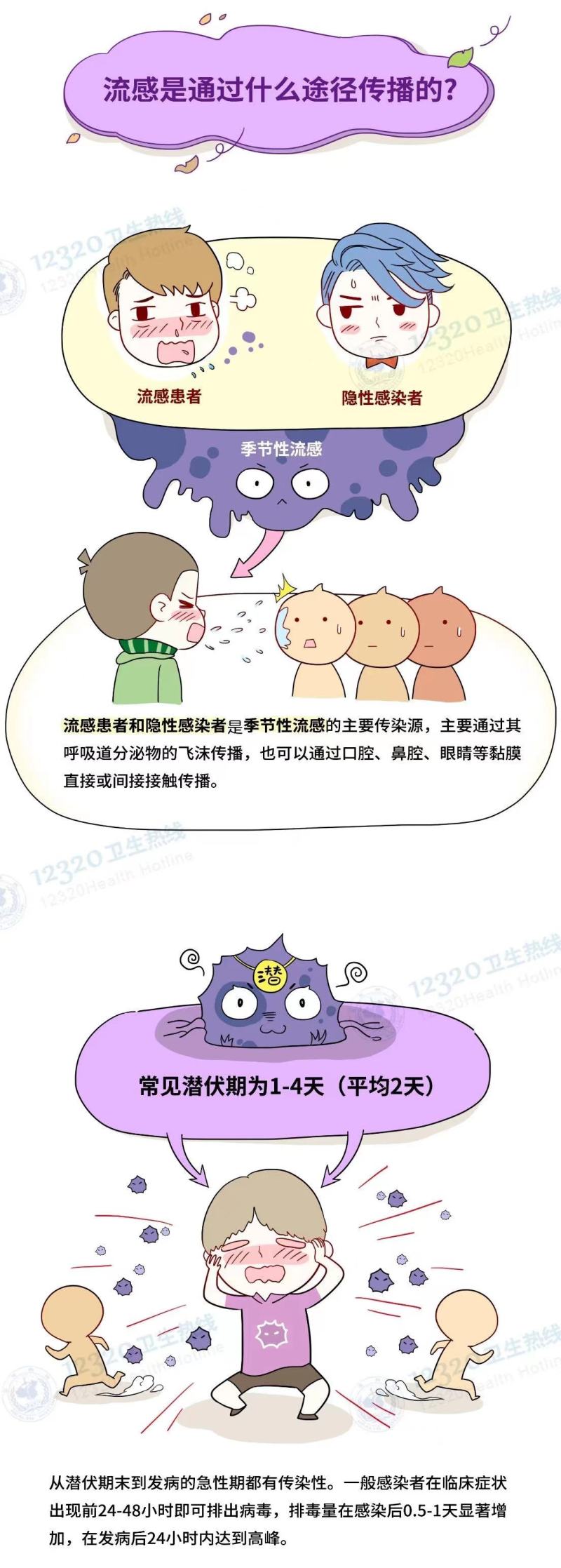 流感患者和隐性感染者是季节性流感的主要传染源,流感的传播途径以飞沫传播为主,也可通过口腔、鼻腔、眼睛等黏膜直接或间接接触传播。在学校、托幼机构和养老机构等人群密集的场所易发生聚集性疫情。