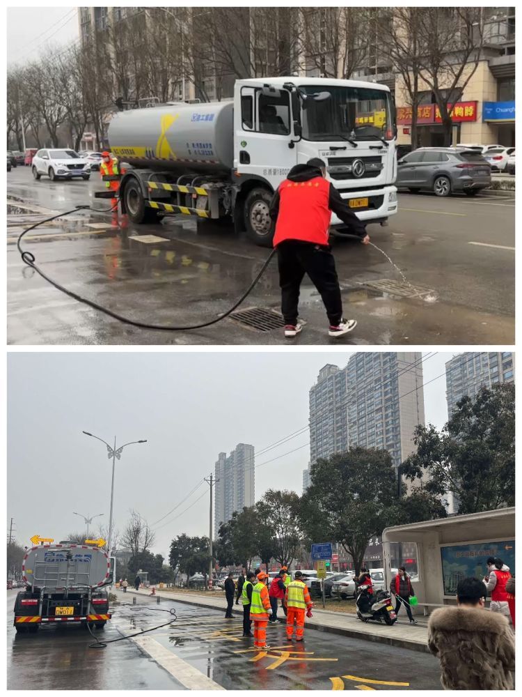 志愿者们纷纷来到小区门口,首先对公交站牌处主干道路进行了冲洗,确保路面干净、卫生。