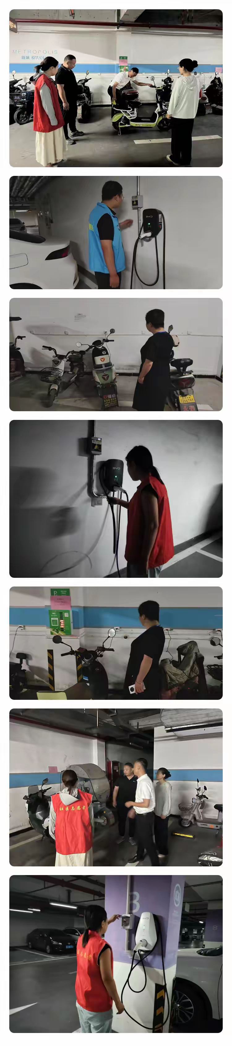 然后,检查小组踏入停车库,目光首先聚焦在充电桩上,检查充电线缆是否有破损、老化的迹象,插头是否牢固连接,以防止漏电、短路等危险情况的发生。其次对电动车停放及充电安全也进行了检查,提醒居民切勿私拉乱接电线充电,不要在充电区域停放非充电车辆,共同维护停车库的充电秩序和安全环境。