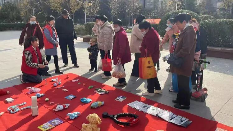 “阿姨,我能用我的小斑马毛绒玩具换这本书吗?”“姑娘,看下这个小镜子能换个啥?”“这个芭比娃娃能换这个玩具吗,阿姨?”……活动现场欢声笑语不断,居民们纷纷带着自己家中的闲置物品来到小区广场,与邻里热情地交流。从儿童玩具到家居用品,从书籍杂志到精致小摆件,在这里,闲置物品不再是被遗忘的角落,而是连接邻里感情、传递温暖与快乐的桥梁。一会了,大家都置换到了自己心仪的物品,脸上都洋溢着幸福的笑容。