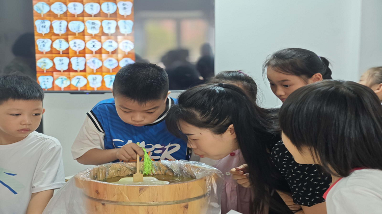 当天课堂上,社区非遗老师向大家介绍了七夕节的传统内涵与节日习俗,讲述了漆扇这一传统技艺的制作技巧和文化意义,并指导孩子们学习“飘漆”技法,利用漆不溶于水的特性,在水面上绘制出绚丽多彩的图案。