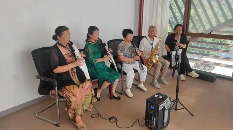 活动室内,大家纷纷拿起自己的电吹管,共同练习曲目《映山红》,长笛的清脆、萨克斯的醇厚、小号的嘹亮……电吹管爱好者们个个精神抖擞,演奏时而激昂澎湃,时而柔情似水,活动室内萦绕着美妙的旋律。乐器演奏间隙,舞蹈队队员也不甘示弱,灵动的手势、稳健的步伐和多变的队形,诠释着对生活的热爱,展示出她们昂扬向上的精神面貌。