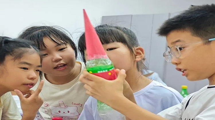 在动手实践环节,“水火箭制作”成为最受欢迎的项目。孩子们自由组合成3至4人的协作小队,利用自备的可乐瓶、硬卡纸、胶带等寻常材料,设计、裁剪、组装、测试,经过近两个小时的精心打造,形态各异、独具匠心的水火箭陆续诞生。当孩子们亲手制作的水火箭“咻”地一声冲向天空时,现场发出阵阵欢呼。