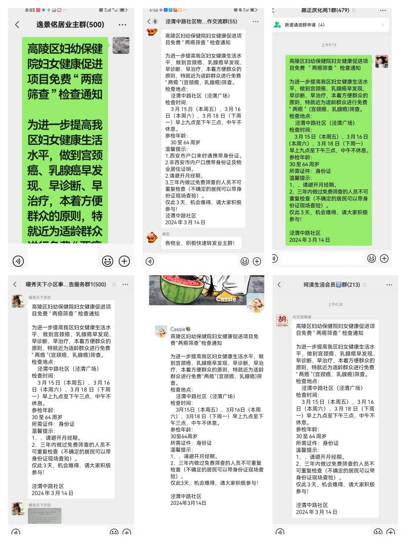 为了扩大辖区适龄女性对两癌筛查的知晓率和参与率,泾渭中路社区工作人员前期通过微信群、朋友圈、宣传单、横幅等方式进行科普宣传,提前联系有意向参与的居民安排好时间,准备证件参加筛查。