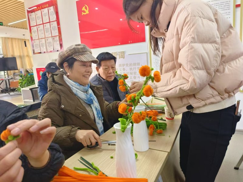 制作过程中,大家热情高涨,积极动手尝试,充分发挥自己的想象力和创造力,将一根根普通的扭扭棒变成了一个个栩栩如生的“小柿子”。有的居民还别出心裁地为柿子添加了一些小装饰,让作品更加独特。现场欢声笑语不断,大家互相交流、互相帮助,气氛十分融洽。