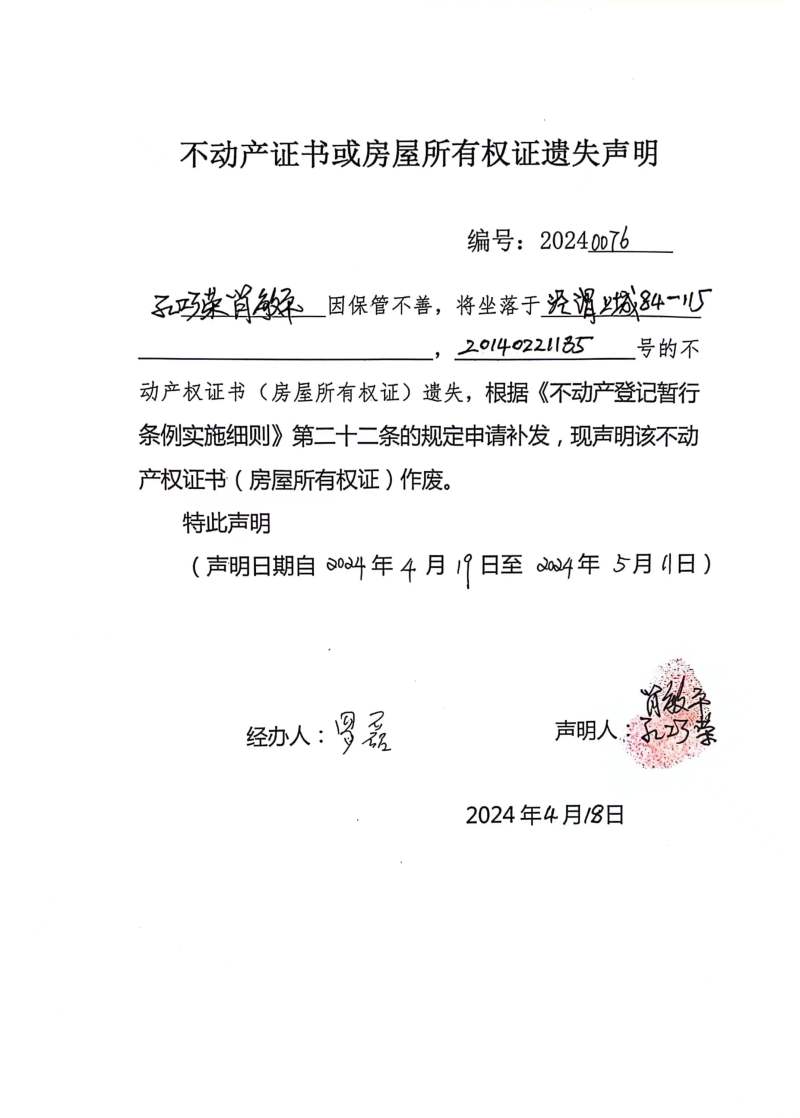 孔巧荣、肖敏平不动产证书或房屋所有权证遗失声明编号:20240076