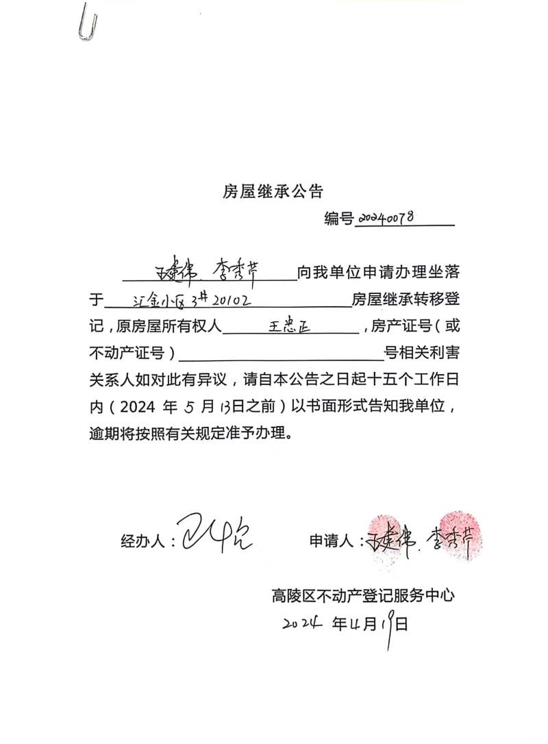 王建伟、李秀芹房屋继承公告 编号:20240078