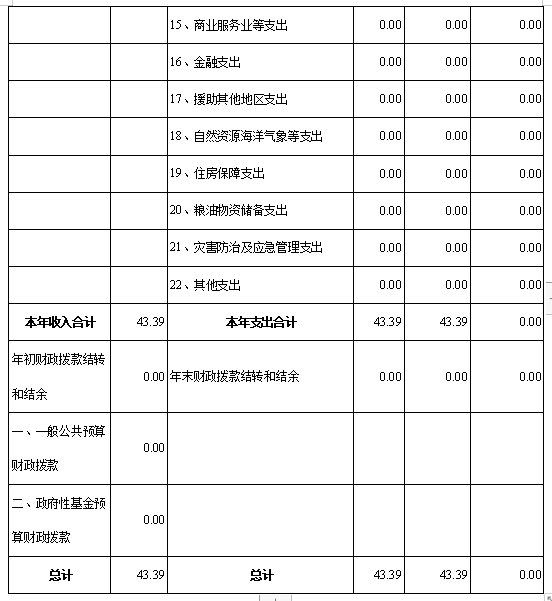 支出总计43.39万元。基本支出43.39万元、项目支出0.00万元,与上年持平,主要原因为没有发生。