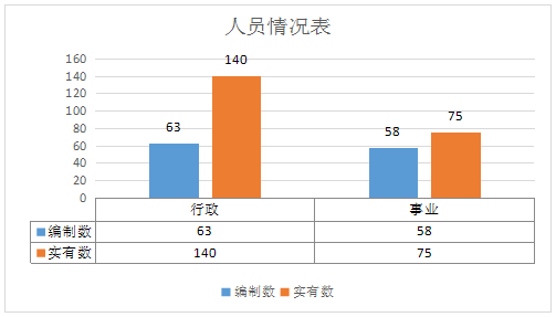 截至2019年底,本部门人员编制121人,其中行政编制63人、事业编制58人;实有人员215人,其中行政140人、事业75人。单位管理的离退休人员1人。