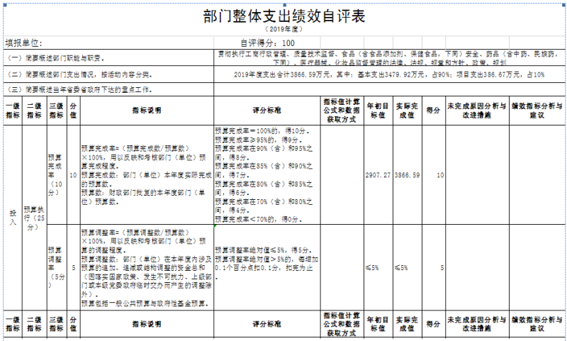 | 项目资金 | 100万 | 年初预算数 | 全年预算数 | 全年执行数 | 分值 | 执行率 | 得分 | ||
