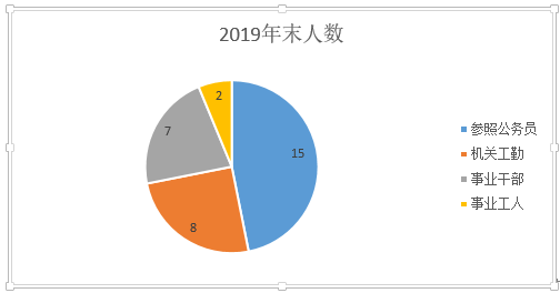 截止2019年底,单位编制人数25人,年末实有人数32人,其中参照公务员管理15人,机关工勤8人,事业干部7人,事业工勤2人。