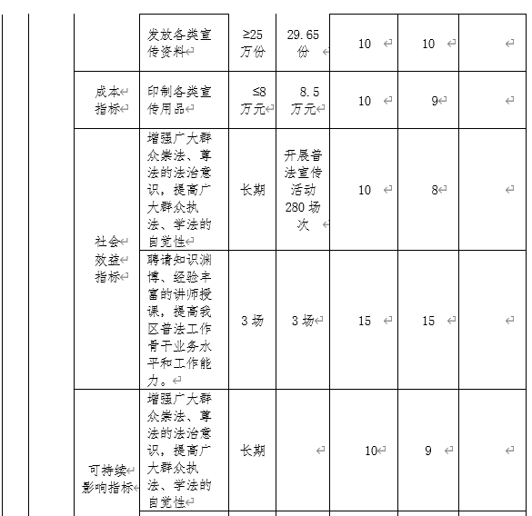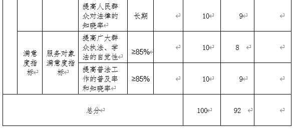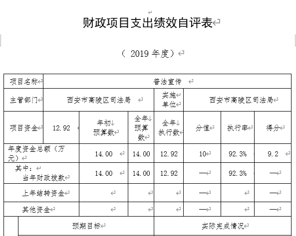普法宣传项目绩效自评综述:根据年初设定的绩效目标,项目自评得分92分。项目全年预算数14万元,执行数 12.92万元,完成预算的92.29%。