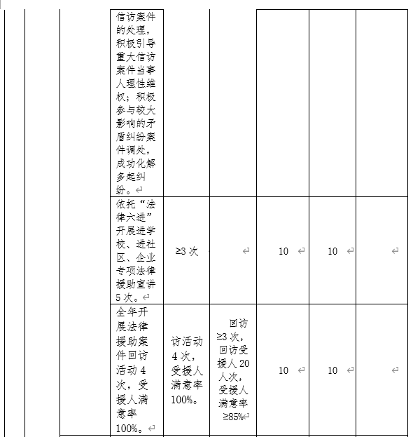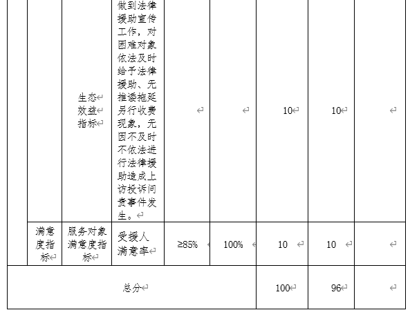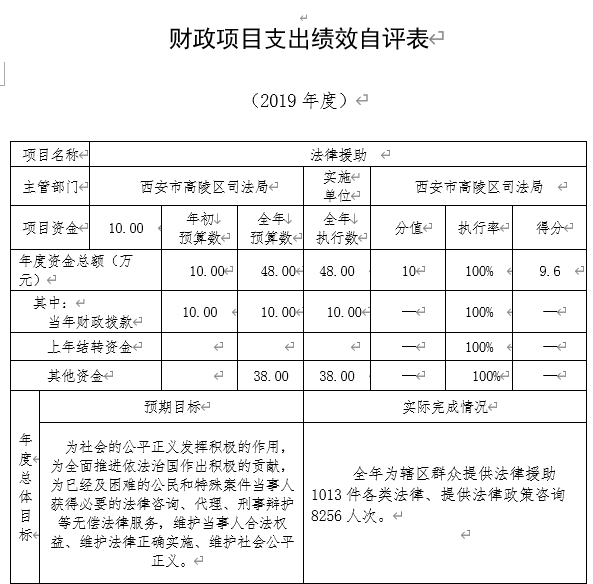 法律援助项目绩效自评综述:根据年初设定的绩效目标,项目自评得分96分。项目全年预算数10万元,执行数 48万元,完成预算的100%,年中中省办案业务经费下达38万。