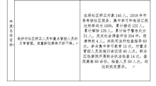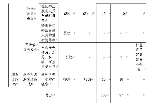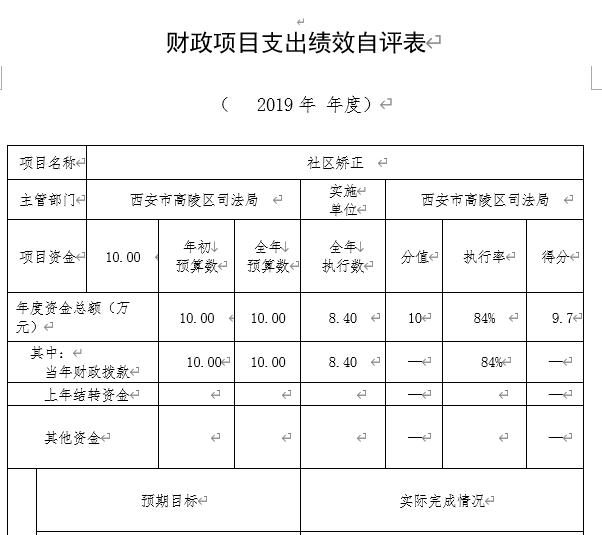 社区矫正项目绩效自评综述:根据年初设定的绩效目标,项目自评得分97分。项目全年预算数10万元,执行数 8.40万元,完成预算的84%。