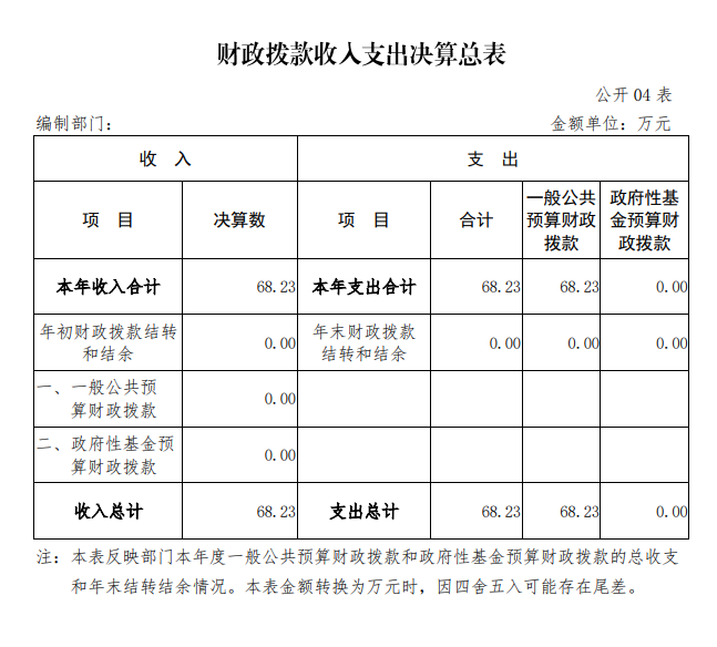 2019年度财政拨款支出年初预算为68.23万元,支出决算为68.23万元,完成年初预算的100%。(决算数与预算数持平)