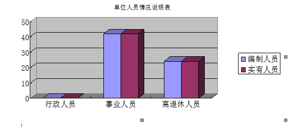 截止2019年底,本单位人员编制32人,其中行政编制0人、事业编制32人;实有人员42人,其中行政0人、事业42人。单位管理的离退休人员24人。
