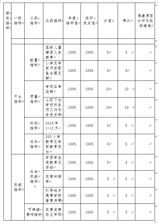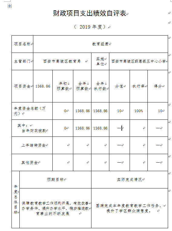 小学教育经费等项目绩效自评综述:根据年初设定的绩效目 标,项目自评得分 100 分。项目全年预算数1368.86万元,执行数 1368.86万元,完成预算的 100%。主要产出和效果:项目资金的足额保障,提升了办学条件,促进了义务教育均衡发展。 通过项目实施,保障了教育教学工作的顺利开展。
