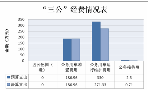 2019年度“三公”经费财政拨款支出决算中,因公出国(境)费支出决算0万元,占0%;公务用车购置费支出186.96万元,占40.73%;公务用车运行维护费支出决算271.33万元,占59.11%;公务接待费支出决算0.71万元,占0.16%,具体情况如下: