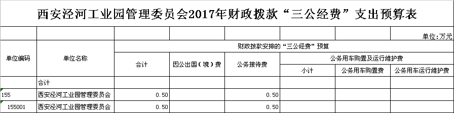 西安泾河工业园管理委员会2017年“三公”经费预算0.50万元,较2016年预算2.00万元减少1.50万元,降幅75%。其中: