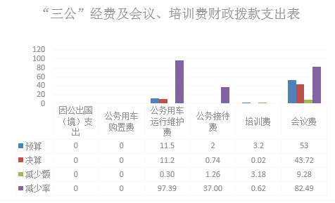 2019年度“三公”经费财政拨款支出决算中,因公出国(境)费支出决算0万元,占0%;公务用车购置费支出0万元,占0%;公务用车运行维护费支出决算11.2万元,占93.8%;公务接待费支出决算0.74万元,占6.2%。具体情况如下: